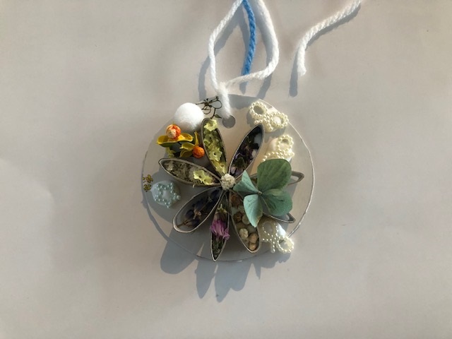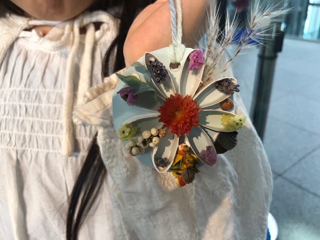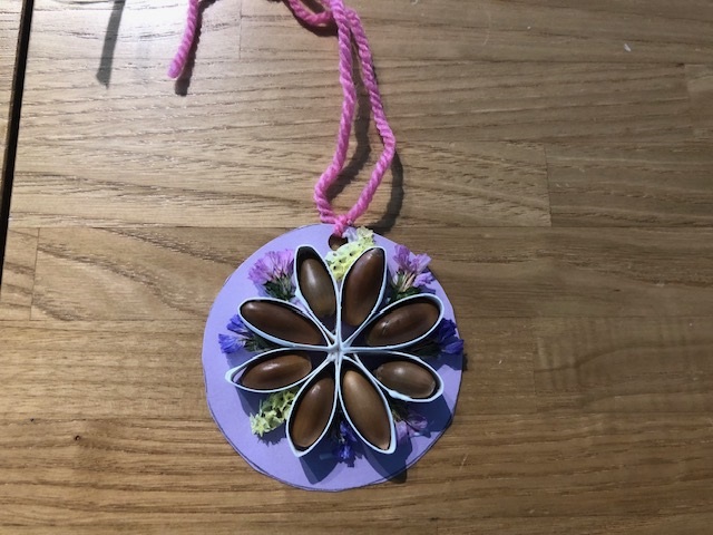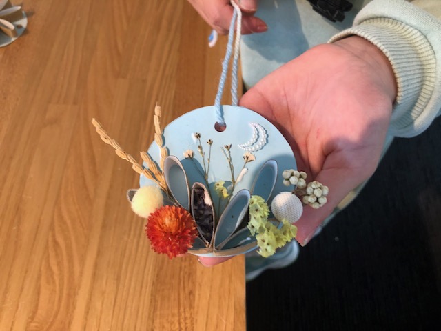 昨年度は松ぼっくりを使った「ミニミニツリーを作ってみよう!」、今年度は首に下げてイベントを楽しめるように木の実を使ったペンダントの作成を行うこととした。土台は予め準備し土台に木の実やドライフラワーなど飾り付けを行い毛糸でペンダントにすると完成!!
